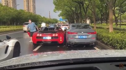 Bugatti en BMW vechten om plekje op rijbaan