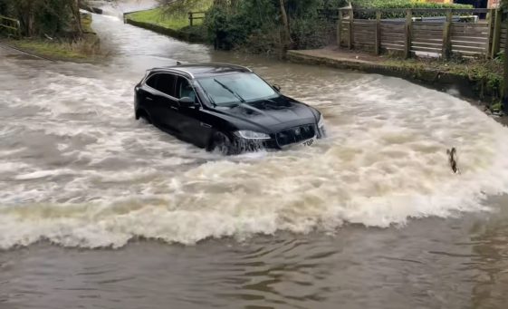 Bestuurder gaat door diepe plas met Jaguar F-Pace