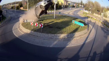 Suzuki Swift knalt in volle vaart op rotonde