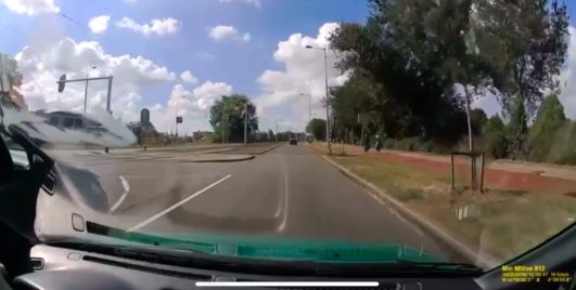 Suzuki Swift knalt in volle vaart op rotonde