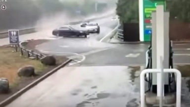 Mercedes-Benz crasht tegen BP tankstation in heftige regen